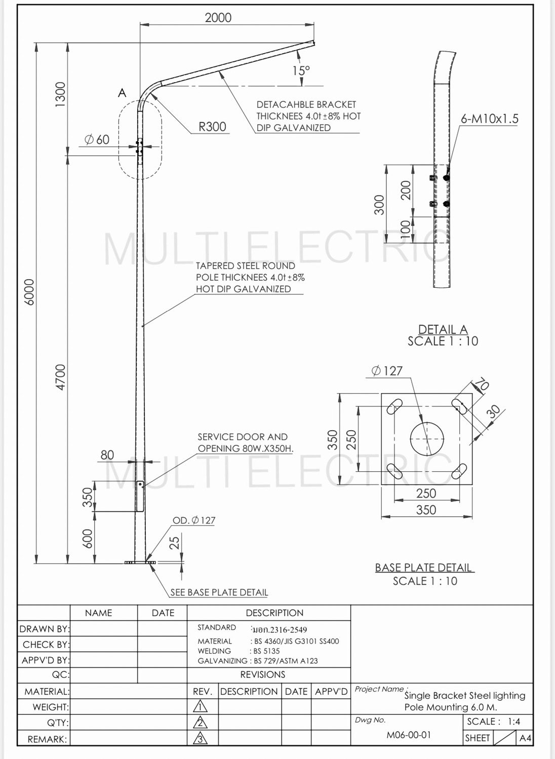 เสาไฟถนน เทเปอร์ กิ่งเดี่ยว 6 เมตร ( Single-Bracket Lighting Pole 6 meters )
